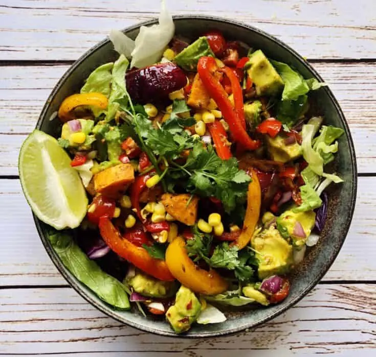 This vegan Santa Fe Salad is a bold fusion of flavours, with crunchy salad, tangy avo salsa and beautiful marinaded veggies. Santa Fe Salad is a must try!