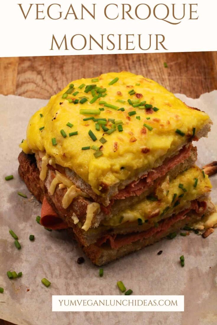 A croque monsieur is a classic French toasted sandwich, ordinarily containing layers of ham and gruyere cheese, with a simple bechamel sauce. Like much French cuisine, it is not by nature vegan friendly, as many French dishes contain meat or butter.