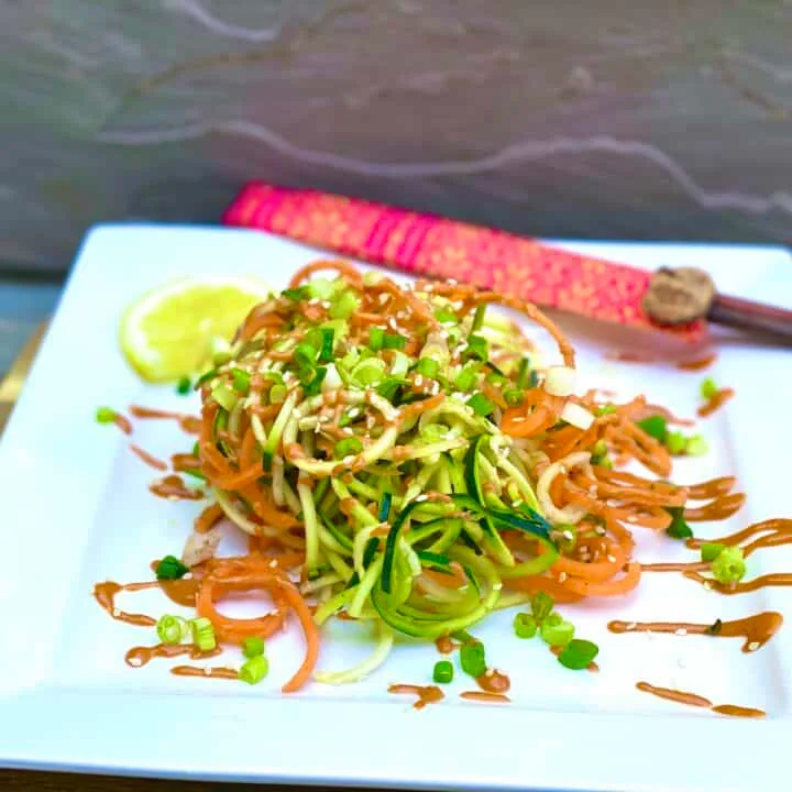 Try this guilt-free low carb vegan salad recipe, made with fresh crunchy zucchini noodles and a delicious satay sauce. Garnished with cilantro, spring onion and sesame seeds this vegan keto salad recipe is the perfect vegan lunch for anyone watching their waistline.