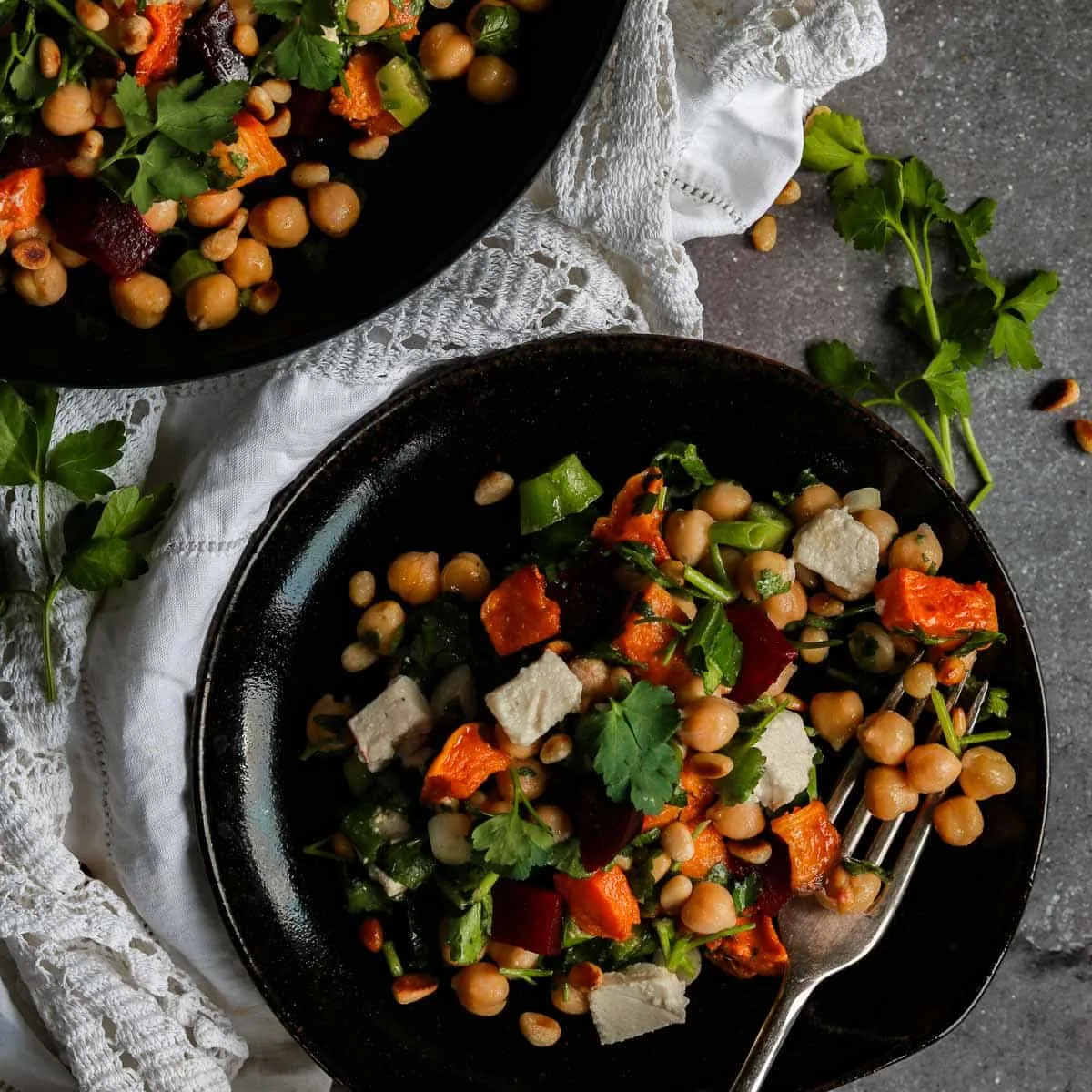 Make this delicious roasted pumpkin salad with beetroot and chickpeas for a fall lunch or a hearty side. Great vegan recipe for autumn!